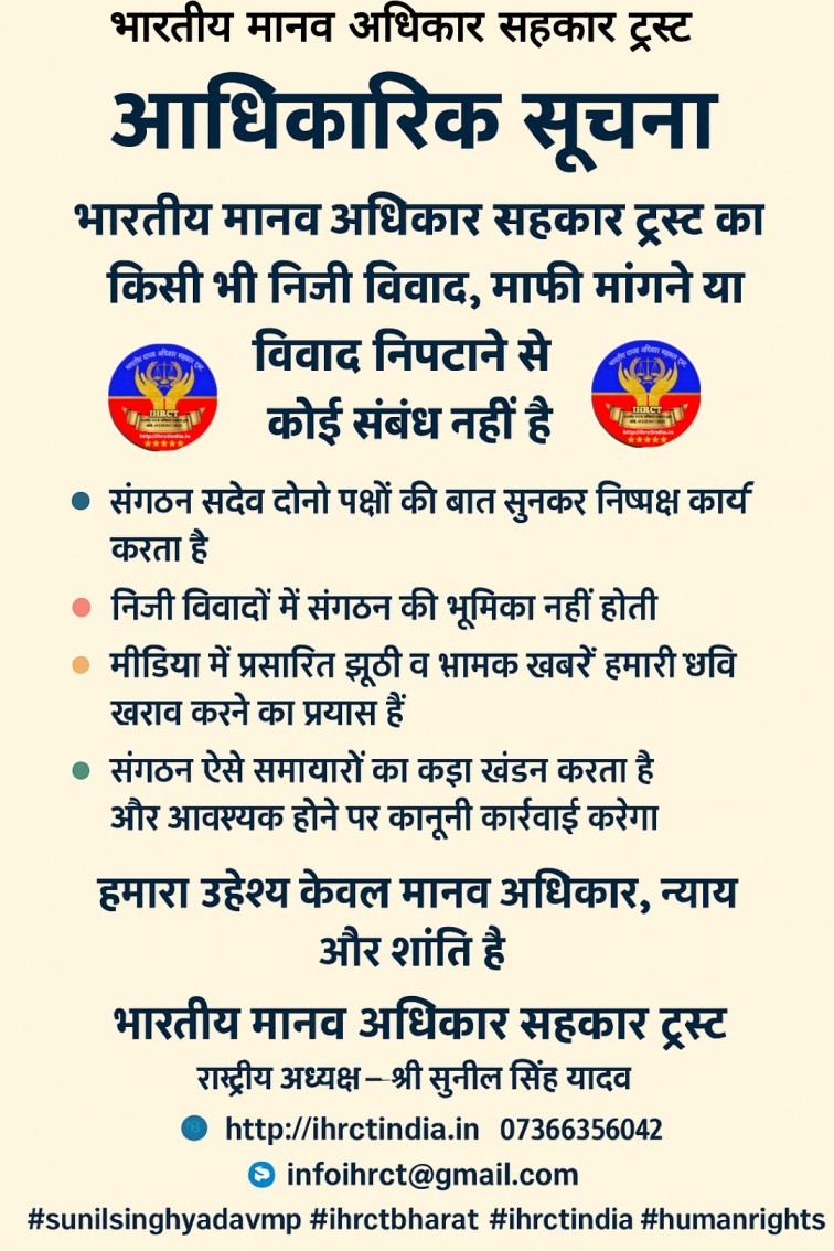 📢 आधिकारिक सूचना भारतीय मानव अधिकार सहकार ट्रस्ट का किसी भी निजी विवाद, माफी मांगने या विवाद निपटाने से कोई संबंध नहीं है। 🔹 संगठन…
